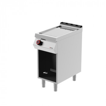 Egylapos elektromos rostlap, nyitott rekesszel. Bordázott felületű, lágyacél főzési felület.
